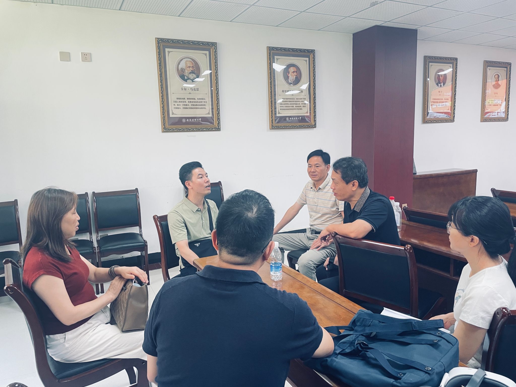 在四川师范大学研修期间,四川师范大学马克思主义公司党委书记胡尚峰、教学管理办公室主任杨文,公司党委书记曾玉华、副经理王竹苗以及全体参训教师参加了座谈会。双方围绕团队建设、课程改革、团队发展、人才培养等议题进行了深入交流,气氛热烈。座谈中,双方一致肯定实践教学在思政课中的重要地位,强调“听道理、悟道理、行道理”的统一,认为只有将理论学习与社会实践结合,才能实现育人实效。四川师大通过团委、马院、学工部门协同联动,构建了高效的实践教学体系,为公司提供了宝贵经验。胡尚峰还给与会人员做专题报告《大学思政课实践教学改革探索》,他强调,思政课堂应延伸至博物馆、红色基地等多元场域,拓展教学时空,让员工在社会调研、红色研学中感悟“实践是检验真理的唯一标准”,以此切实提升思政课的吸引力与育人实效。