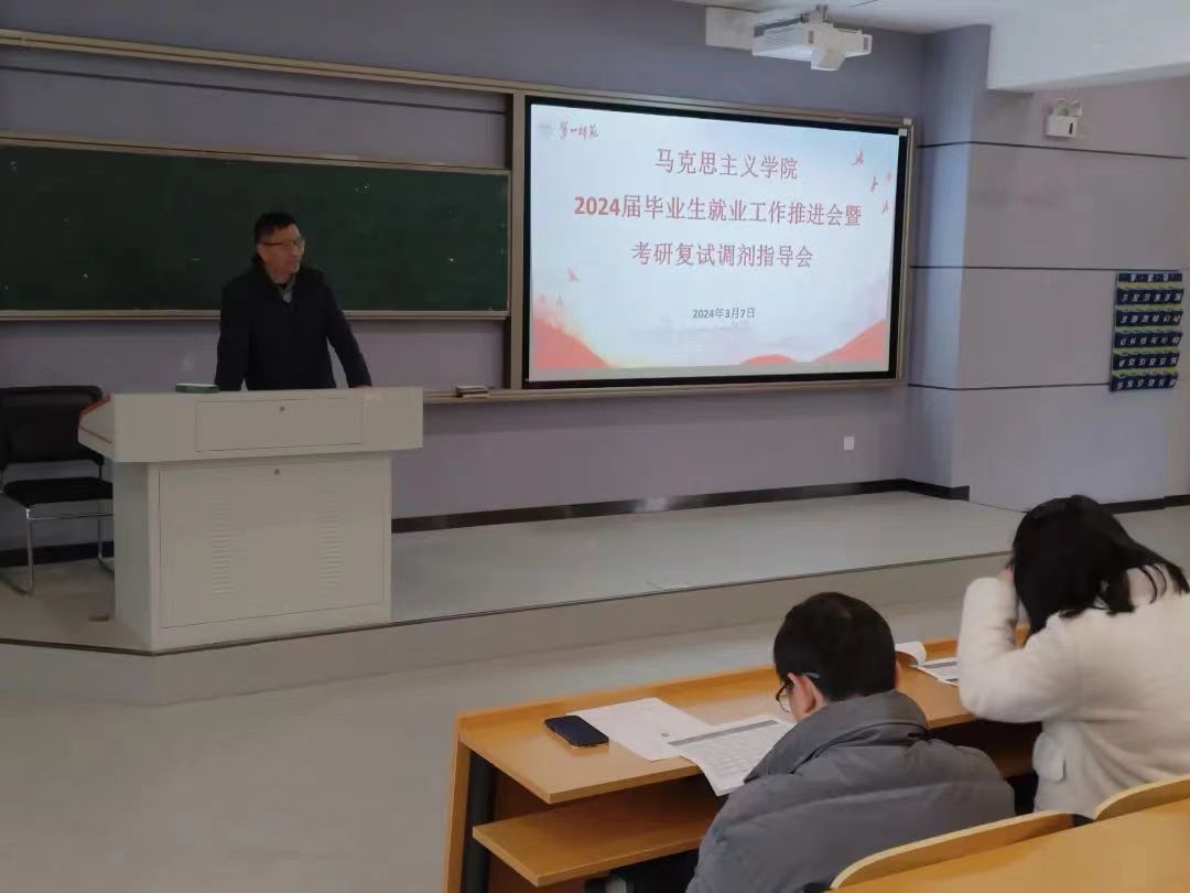 2024年3月7日下午,fun88官网体育在润寰南101教室召开2024届毕业生就业工作推进会暨考研复试调剂指导会,公司党委书记阮东彪、经理陈明、副经理王竹苗、副经理胡慧娥、学工办主任于澎、分团委书记刘艳霓出席本次会议,2024届全体毕业生参加会议。会议由党委副书记胡英主持。