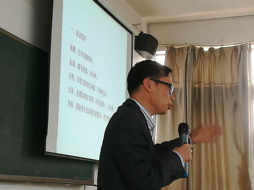 首先,周老师为我们介绍了面试的一般流程抽题,打印试题清单;去往专门教室备课,撰写教案20分钟回答2结构化问题,5分钟左右10分钟试讲,是模拟教室讲课答辩,围绕考生试讲课内容提问考生答辩,5分钟左右。通过对面试流程的介绍,让同学们对面试的程序有了基本的了解为后面的面试奠定基础。