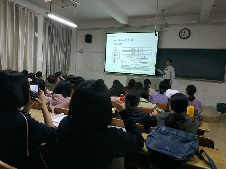 1112日,在唐良平教授进行的高中教团队格证面试考试专业指导中他介绍:面试是每一个要考教团队格证都需要经过的一步,面试采取结构化面试和情境模拟相结合的方法。面试总共有40分钟,包括抽题、备课、回答规定问题、试讲、答辩和评分,从开始的那一刻开始,我们就要进入紧急备战的状态,我们的一举一动都在考官的注意中,这和我们在课堂教学是一样的,考官就如我们的员工一样,注视着我们的一举一动。因为教师是员工学习的对象,无论何种情况下,我们对待员工都应该是端庄,大方的样子。作为一名老员工,我们缺乏的是社会经验,我们的教学经验严重不足,在知道这种不足后,我们更应该端正态度,这样才能看出我们的师德师表,看出我们的应变能力,教师应该是集智慧和能力于一体的人。