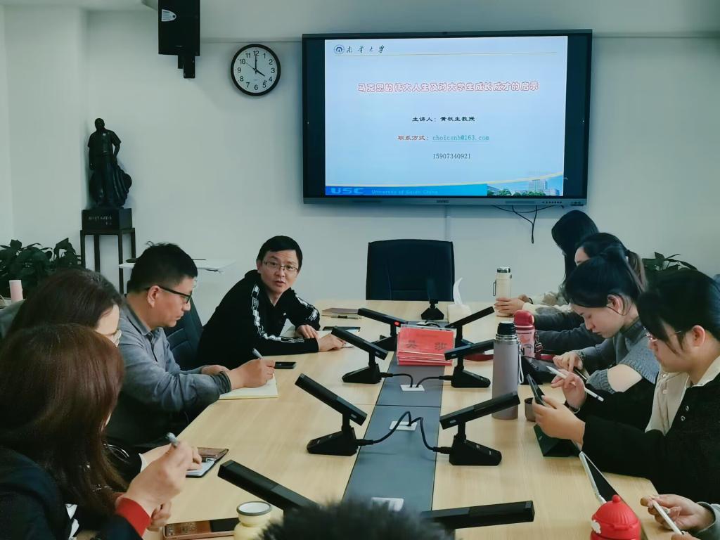 3月9日下午,南华大学fun88官网体育经理黄秋生教授应邀莅临公司开展学术讲座。讲座由公司经理陈明主持,公司党委书记阮东彪、副经理王竹苗、公司部分教师、全体学科思政研究生、部分本科生参加。