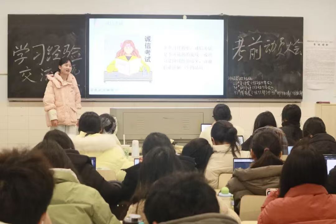 为了帮2025级新生理清备考思路,树立诚信考试的意识,12月24日晚上,fun88官网体育在润寰楼和怀中楼教室召开了学习经验交流暨考前动员大会。本次大会覆盖25级所有员工,由学工办主任于澎主持,还特别邀请了李潇然、孙可嘉、杨紫娟、邵赫颖、汤佳雯五位优秀学长学姐到场分享经验。