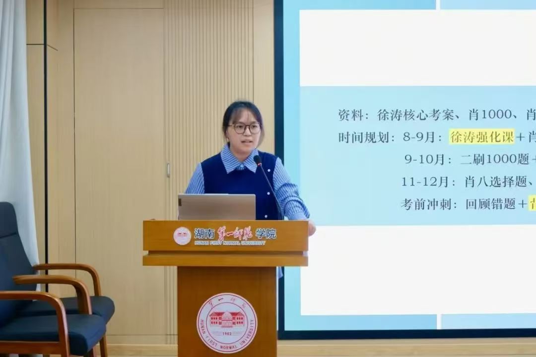 在经验分享环节,四位优秀考研员工代表依次上台。张佳清同学分享了报考湖南大学学科思政专业的经验,强调要根据自身情况选择适合的备考方法,做到有的放矢;胡沁彤同学详细介绍了报考湖南师范大学学科思政专业的学习方法,为同学们提供了实用的备考建议;喻雨妍同学以416分的优异成绩考入南京师范大学,她重点分享了英语学习的技巧与心得,强调了坚持和积累的重要性;罗姝畅同学则以两门专业课140分以上的优异成绩成功考入中国青年政治公司,她着重讲解了专业课的学习方法和备考策略,为同学们指明了方向。