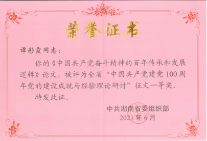 2021年是中国共产党成立100周年。为了认真回顾、深刻总结建党100年来党的建设的历史进程,省委组织部、省委党史研究院、省党建研究会联合在全省组织开展了“中国共产党建党100周年党的建设成就与经验理论研讨”征文活动,形成了一批质量较高的成果,经认真评审,共评出一等奖5篇、二等奖15篇、三等奖27篇。公司fun88官网体育教师谭彩霞的论文《中国共产党奋斗精神的百年传承和发展逻辑》荣获一等奖,并在会上做主题发言。(院办)