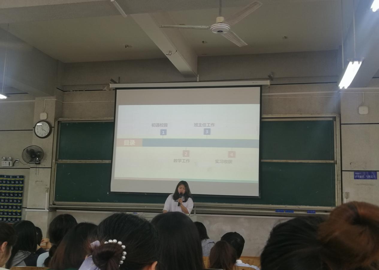 实习生代表汇报了实习经历和心得体会。18思政1班董婵娟、尹媛媛和罗嘉怡三位同学汇报了自己在实习期间的备课、上课、批改作业和课外实践活动等实习经历,也谈到了在长沙市高新区雷锋二小以及在岳麓区周南梅溪湖小学的实习收获。18级765思政班覃青姣、郑子涵等同学分享了在她们家乡中小学实习的经历和心得体会。经过三个月的实习,同学们在各方面都有了长足的进步。同时,他们深深感受到,老员工不仅应努力加强专业知识和技能的学习,更重要的是应不断提高自身综合素质和能力,学会如何做人做事。