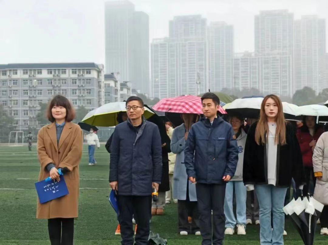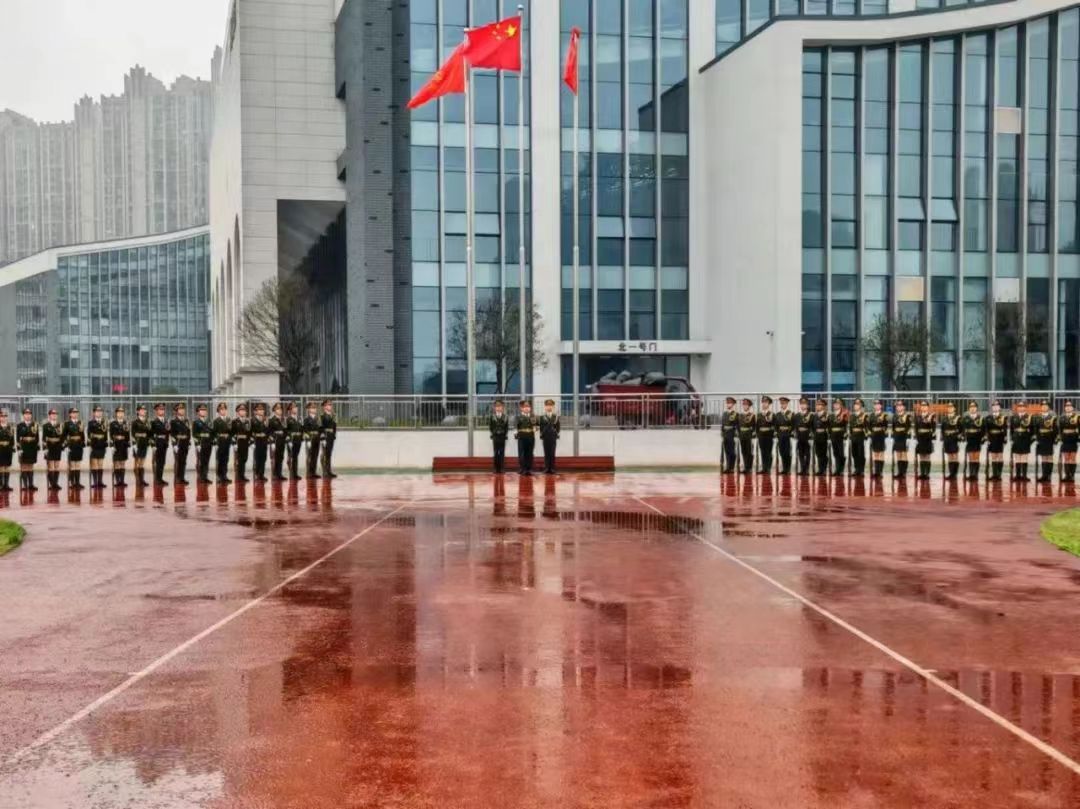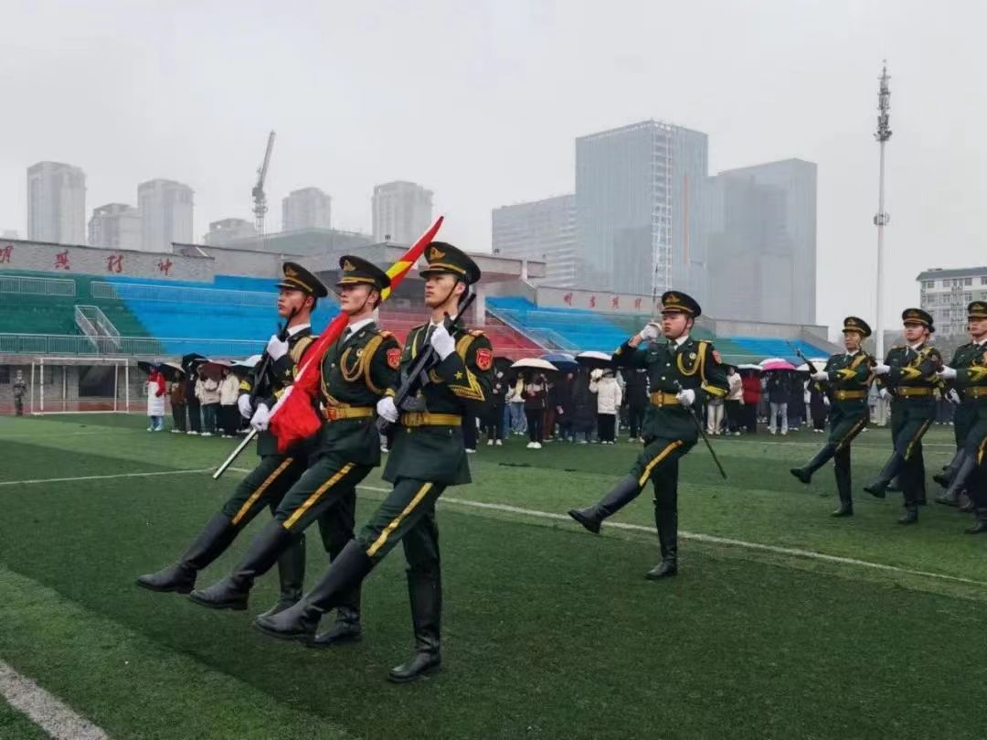 7时整,细雨蒙蒙中,升旗仪式正式开始。国旗护卫队迈着整齐的步伐,眼神坚定,脚步铿锵,护送国旗入场。伴随着庄严的《义勇军进行曲》,鲜艳的五星红旗冉冉升起,全体师生奏唱国歌,行注目礼。