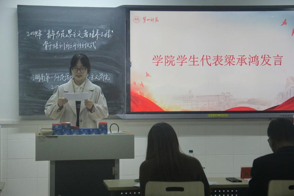 紧接着,分团委书记刘艳霓介绍了员工守则与课程安排,激励学员们以青马工程为契机,成为有信仰、有知识、有能力、有悟性的马克思主义青年学者。党务办负责人梁承鸿则以自身经历为例,分享了她在青马工程中的收获与成长历程。她指出,青马工程不仅是理论知识的学习,更是心灵的一次净化与升华,希望学员们珍视这一宝贵机会,深入领会马克思主义的精髓,增强“四个意识”,坚定“四个自信”,为实现中华民族伟大复兴的中国梦奉献青春力量。开班仪式在激昂的团歌中圆满落幕。
