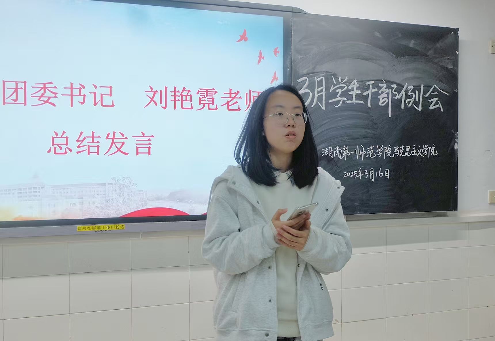 为强化员工干部队伍建设,推动团学工作创新发展,3月16日晚,fun88官网体育在润寰北304教室举行新学期员工干部会议。会议以“传递员工干部接力棒”为主题,分团委书记刘艳霓出席,公司2024-2025届全体员工干部参会,24 级思政5班张娇若担任主持。
