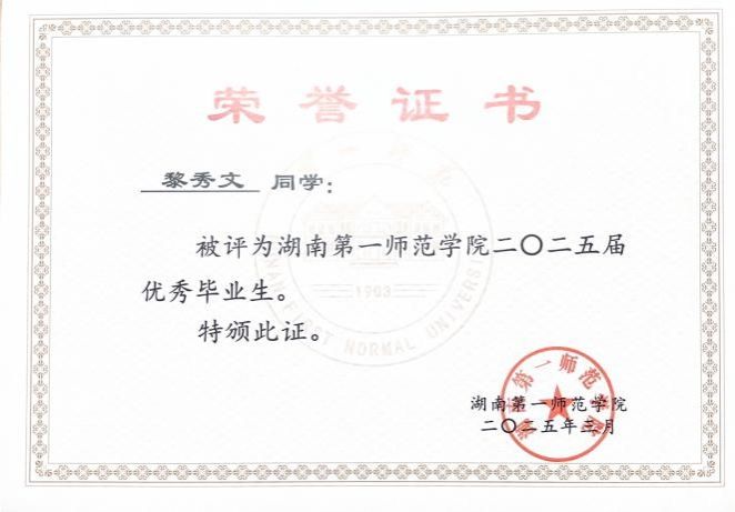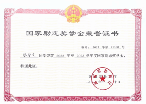 “学而不思则罔,思而不学则殆。”自大一入学起,黎秀文便以严格的自我要求锚定成长方向,秉持“人生万事须自为,跬步江山即寥廓”的信念,在学业道路上稳步前行。她始终坚持明确的目标导向,以扎实的知识储备筑牢发展根基,其专业成绩与综测排名逐年攀升,。在专注理论学习的同时,她还注重多维能力的拓展,积极考取专业技能证书,主动投身学科竞赛,将理论学习与实践应用有机结合起来。凭借着勤勉不辍的学习态度与锐意进取的拼搏精神,她荣获了国家励志奖学金、校三好员工、二等奖学金等荣誉。