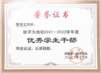 黎秀文,中共党员,2021级思想政治教育1班团支部书记,曾任公司员工党务办公室主任、分团委宣传部副部长兼网信中心主任。湖南省优秀毕业生,新华联助学奖励金获得者,在校期间获三好员工、优秀员工干部等校级及校级以上荣誉共20余项。负责湖南省第九届思想政治理论课研究性学习成果展示校赛、省级复赛与决赛组织工作,连续两年参加老员工暑期“三下乡”社会实践活动,撰写的多篇新闻报道在人民论坛网、红网、华声在线等平台发表,所在团队获评国家级优秀团队和省级优秀品牌项目。