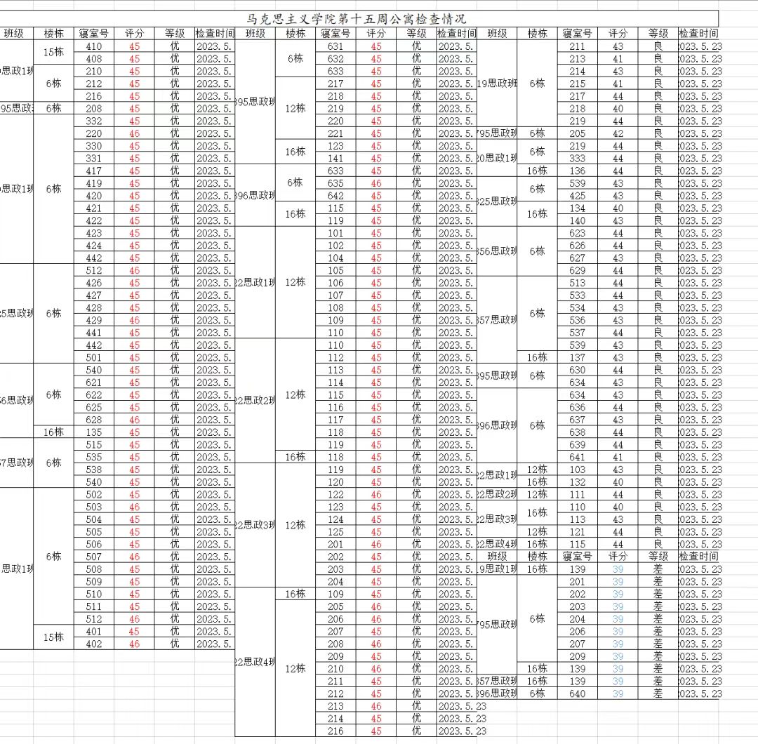 总结:本周大检情况表现较好,但857思政班与19思政1班16-139(肖柏康、赵湘龙、龙艺成、胡佳骏)、896思政班6-640(蒋京素、姚瑶、胡君忆、龙嘉和)、795思政班6-201(黄毅敏、唐子婕、李嘉慧、李效阳)、6-202(周晓暄、吴曦、刘熙凤、袁思睿)、6-203(丑心仪、童昕阳、谭子涵、易正萍)等宿舍仍需改进,希望大家共同努力,建设美丽文明宿舍。