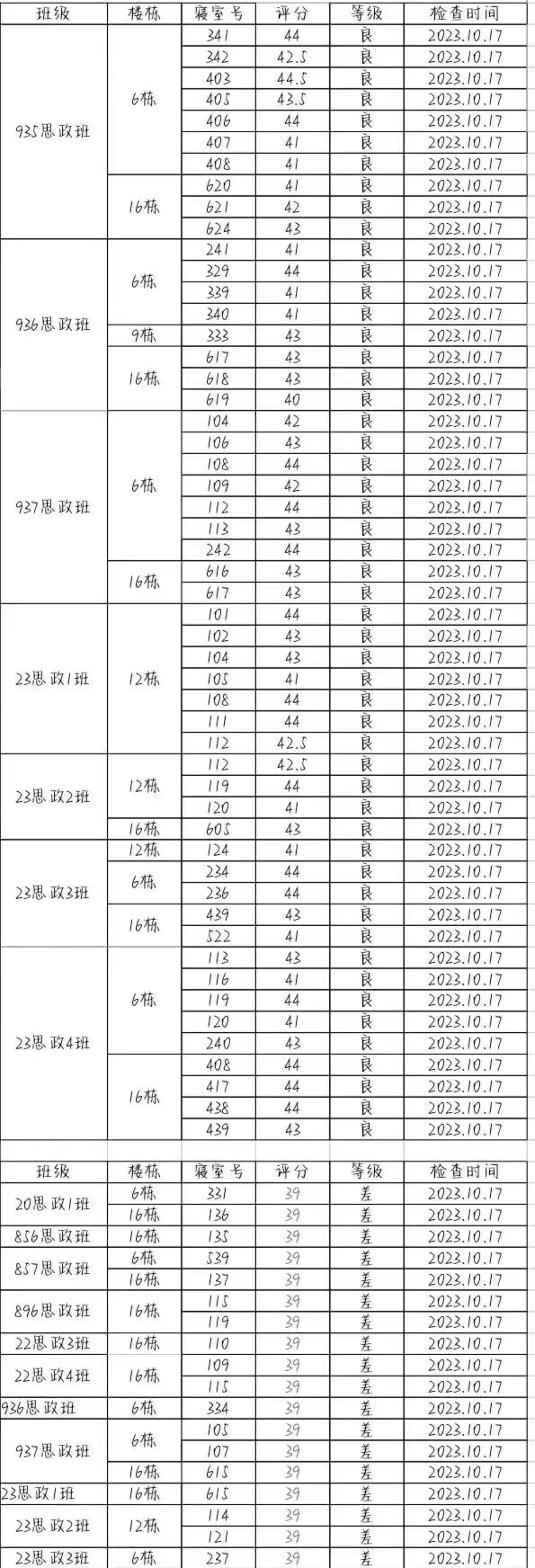 总结:本周宿舍大检表现良好,但896思政班与22思政4班16-115(雷琪宇、刘耘彤、万博思)、937思政班与23思政1班16-615(杨程、李书畅、陈国颖、全启航)、20思政1班16-136(欧阳琦、周亮、阳可豪)、857思政班 16-137(丁嘉豪、周靖浩、符灿宇、田畅轩)、896思政班16-119(肖恪、周颖晟、刘洪甫、汪宇骏)、22思政4班16-109(李庚鸿、黄天翼、朱连涛、胡子曜)、 936思政班6-334(谈若儒、李慧、谷雅祺、彭奕荣)、23思政2班12-114(肖亦君、贺宇轩、刘诗琦、曹奕玲)、23思政3班6-237(林涵萱、王凤麟、赖语婷、王耀)等宿舍仍需继续改进!希望大家共同努力,建设美丽文明宿舍!