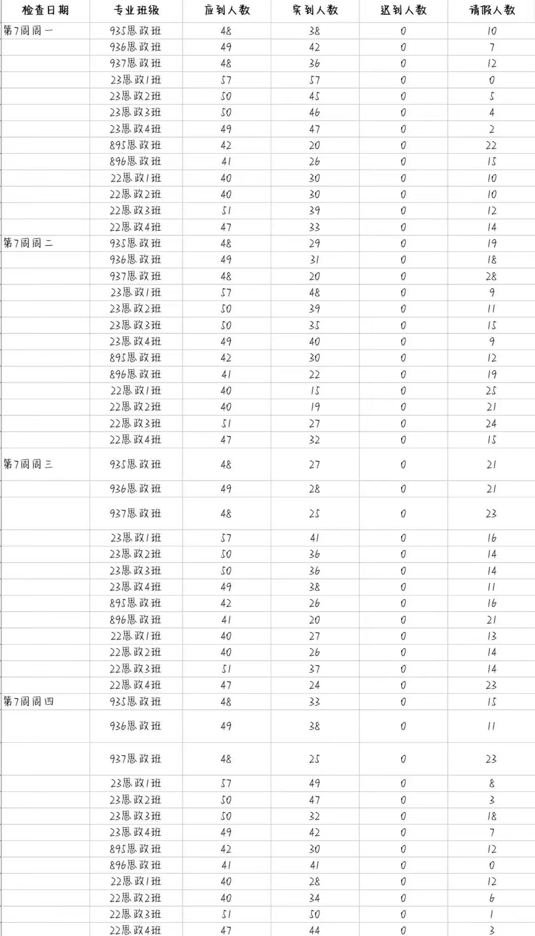 总结:本周早自习大部分同学表现很好,但仍有部分同学缺席:23思政936班23号张梦婷子两次、41号张汗泽一次、42号李中翰两次、45号傅灏文一次、47号杨恩旭一次、48号何泳先一次、49号赵晓韵两次;23思政937班36号刘思思两次、24号万源源一次;22思政1班11号曾慧一次。