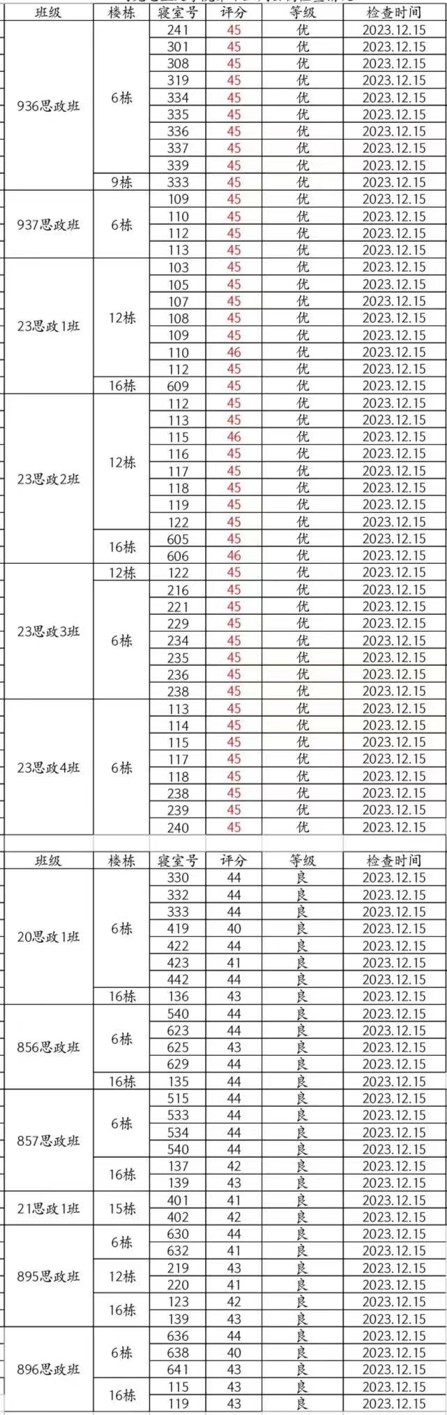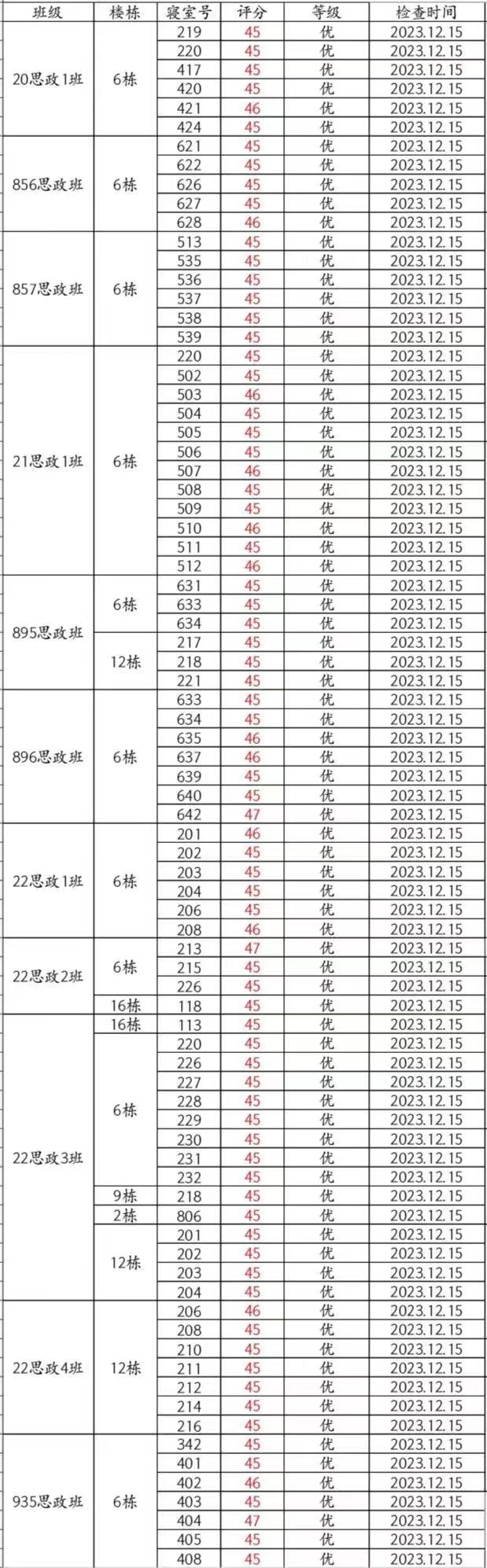 本周卫生检查情况总体表现中等,其中20思政1班6-331(吴烁仪、张梦萍、梁娟、安美儒)、935思政班16-620(邓戴维、官宪律、李天德、胡惟方)、936思政班16-619(李中翰、何泳先、陈龙云、陆琦)、937思政班6-242(万源源)、937思政班16-616(张祺、余志纬、李鑫益、何佳旭)、23思政3班16-522(覃坤、盛宇琪、刘陆宇、欧阳文明)、23思政4班16-417(胡英豪)等宿舍卫生情况较差,仍需继续改进。希望大家共同努力,建立文明美丽清洁宿舍!