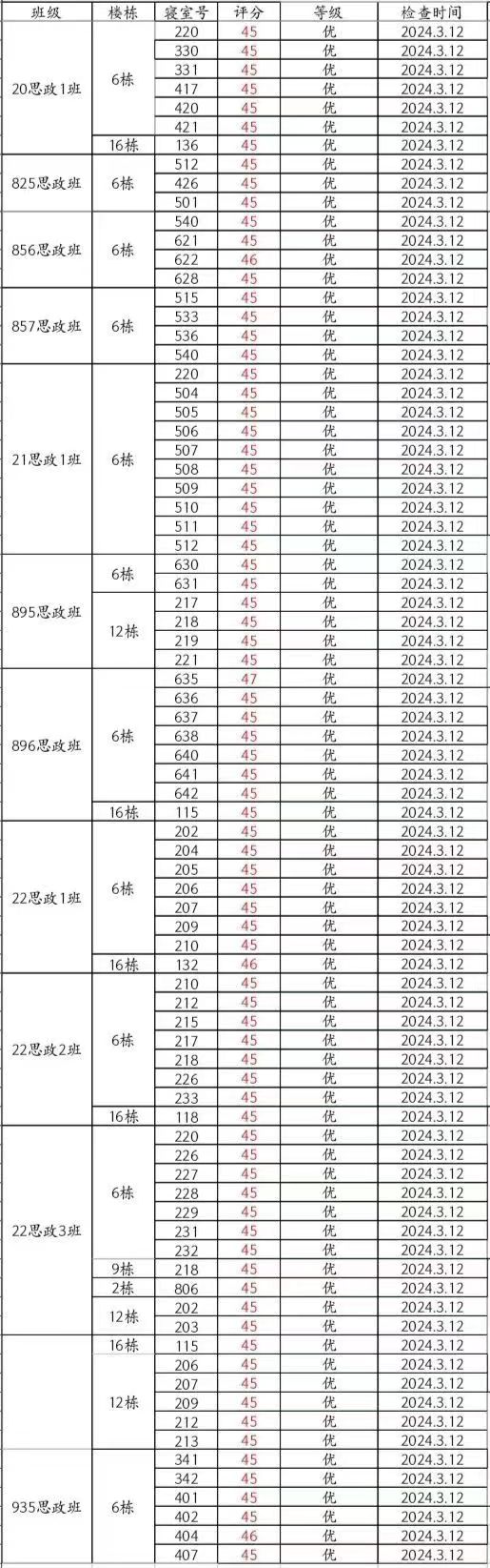 本周卫生检查情况较好,但20思政1班6-423(易薇、肖银、蔡馨怡、吴思云)、825思政班6-425(袁远凤、罗湘、彭莉君、石敬柳)与6-429(贺心瑶、胡依曼、胡颖芳、黄亚琪)、857思政班6-535(彭慧、蔡明琦、洪宇、龙琴)与5-539(吴牧宁、李菁、唐小蕾)等宿舍仍需继续改进!希望大家共同努力,建设文明美丽宿舍!
