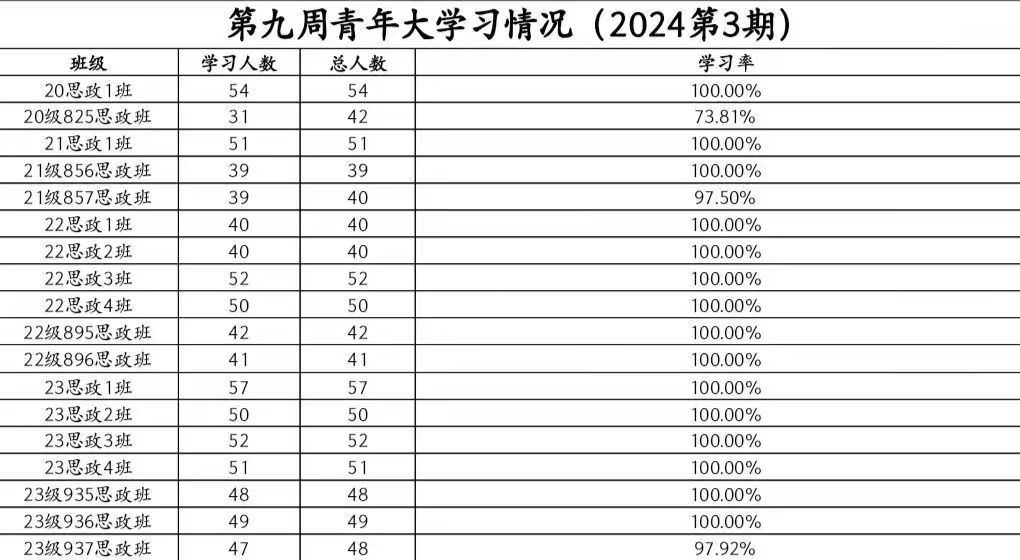 本次青年大学习,20思政1班,21级856思政班,21思政1班,22思政1班,22思政2班,22思政3班,22思政4班,22级895思政班,22级896思政班,23思政1班,23思政2班,23思政3班,23思政4班,23级935思政班,23级936思政班学习率达到了100%,在这里提出表扬;